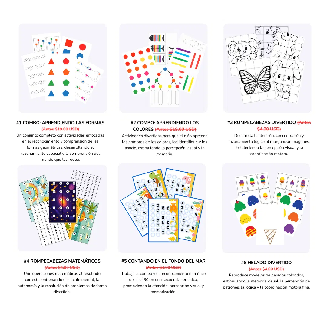 El Combo de Gimnasia Cerebral ofrece más de 80 actividades y desafíos cognitivos que fortalecen foco, memoria, lógica y percepción visual, con videos y manual de aplicación listos para imprimir y usar, sin depender de pantallas.